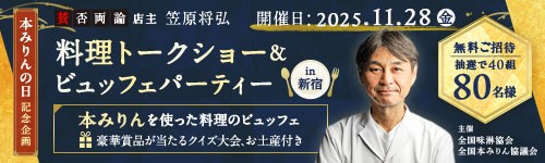 みりん業界は、11月30日を(11「いい」30「みりん」を「本みりんの日」と制定し、「本みりん」のPRに努めています。全国味淋協会と全国本みりん協議会は、みりん研究会の後援を受け11月29日(金)に「『賛否両論』店主 笠原将弘氏 料理トークショー」&「ビュフェパーティー」をリストランテ ベニーレ ベニーレ(新宿三丁目)で開催致します。このイベントに一般応募者80名様を無料招待いたします。 申込期間は9月11日~10月16日です。(応募は終了いたしました)